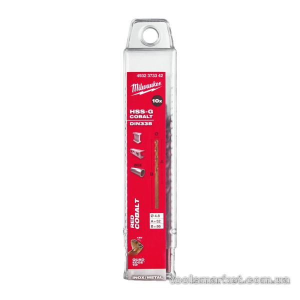 Свердло по металу HSS-Co MILWAUKEE, DIN338, Ø4,8х86х52мм, (10шт)
