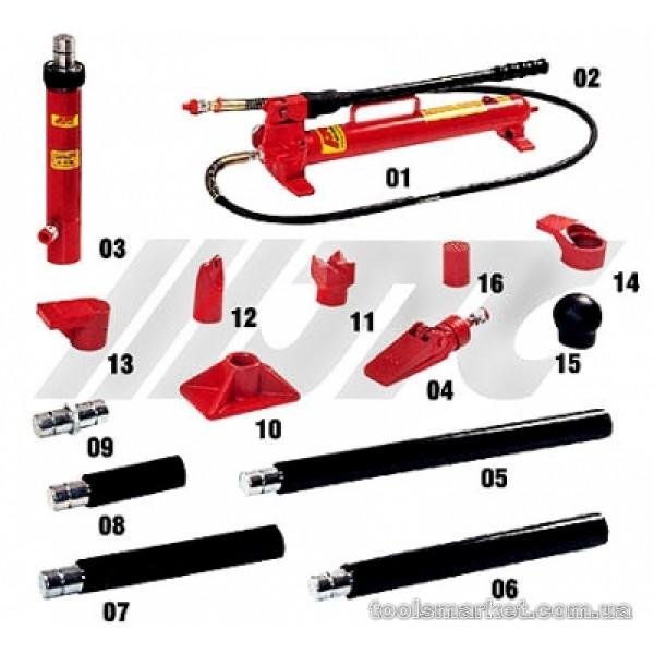 - Набор гидравлического инструмента представляет собой компактный и удобный в эксплуатации комплект из гидравлического насоса (1) и гидравлического цилиндра (3), с помощью которых создается рабочее усилие; удлинителей для упрощения работы (5-8); специальных фигурных соединяющих насадок (11-16), для надежного упора в детали кузова.