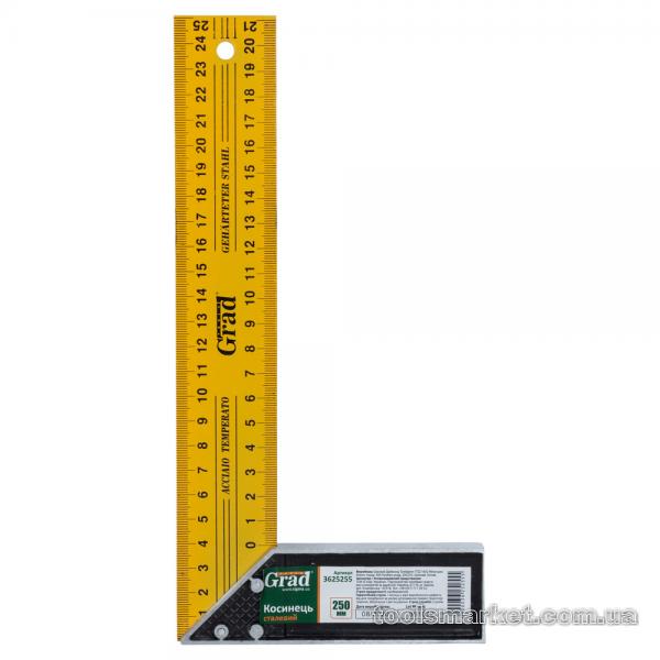 <p style="text-align: justify;"> <b>Косинець сталевий 250мм GRAD (3625255)</b></p><p style="text-align: justify;"> Металевий косинець з пофарбованою поверхнею та двосторонньою розміткою полотна.</p><p style="text-align: justify;"> Призначений для розмітки та перевірки прямих кутів, а також для перевірки кута 45° при обробці та збиранні виробів.</p>