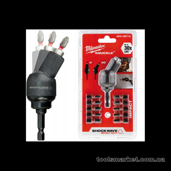 Кутова насадка Knuckle (1 шт) Кутова насадка для важких умов роботи Навантаження ударні. Може використовуватися як у бездротових дрилях, так і імпульсних гвинтовертах. Компактна кутова насадка. Ідеально підходить для роботи в обмежених та тісних просторах. Міцна металева конструкція для поглинання ударного імпульсу. Робочі позиції 0° та 30° Хвостовик ¼″ Hex вставляється безпосередньо в патрон, що запобігає прослизу. Підходить для роботи з імпульсним гвинтовертом Hex ¼″, що крутить момент до 180 Нм. * Висота 40 мм при нахилі 30 ° Комплектація 1 кутова насадка KNUCKLE™ 1 x PH1 / 2 x PH2 1 x PZ1 / 2 x PZ2 / 1 x PZ3 1 x TX15/1 x TX20/1 x TX25