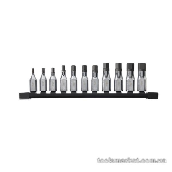 → Набір головок торцевих хромованих ¼” MILWAUKEE, з бітою Hex (4-14мм) на планці, (11шт)
