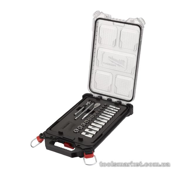 Набір головок торцевих хромваних метричних ¼” PACKOUT MILWAUKEE, з воротком (28шт)