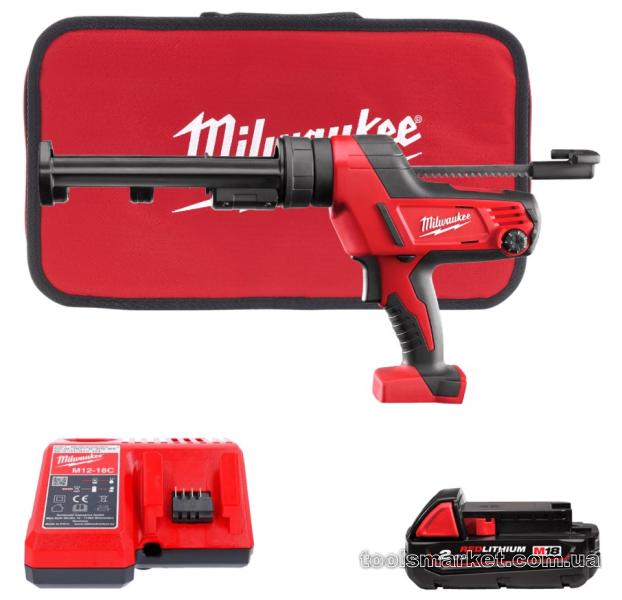 Пістолет для герметиків акумуляторний MILWAUKEE, C18 PCG/310C-201В, 310мл (+тримач картріджа, в сумці для інструментів)