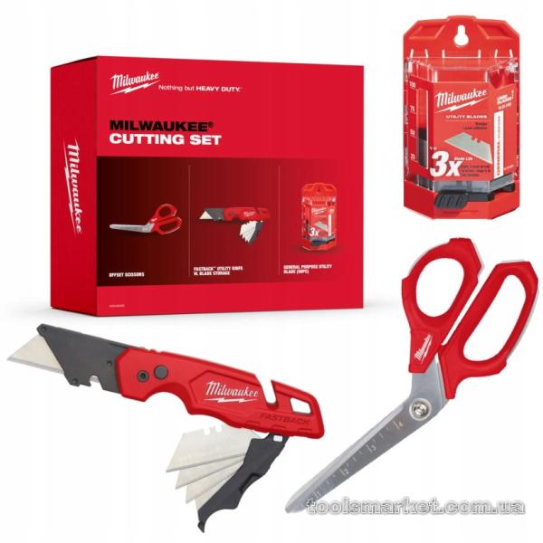 Набір різальних інструментів Milwaukee: універсальні ножиці, складаний ніж FASTBACK™ та упаковка з 50 змінних трапецієподібних лез для ножа. Універсальний набір для різання багатьох матеріалів.