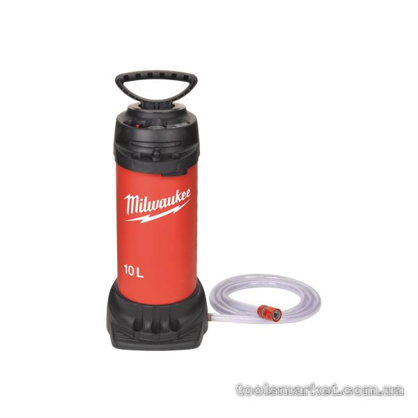 Резервуар для води WT10 (1 шт.). Водяний нагнітальний насос для установки алмазного буріння Milwaukee WT 10 призначений для автономного постачання води при свердлінні отворів. Незамінний на будівельних майданчиках та інших об'єктах, де відсутній водогін. Металевий бак об'ємом 10 літрів покритий зсередини та зовні поліестером для запобігання появі іржі. Заподіяти баку механічні пошкодження практично неможливо. Витримує падіння з висоти 3-го поверху без пошкодження поліестерового покриття та з 9-го поверсі без розриву самого бака. Має потужну механічну помпу, яка дозволяє створити робочий тиск 6 бар. Вам достатньо 10-12 разів качнути помпу і створений тиск забезпечить безперервну подачу води в потрібній кількості до половини об'єму бака. Основа бака має спеціальний майданчик, який дозволяє надійно встановити насос у правильному вертикальному положенні без ризику його перекинути. Насос має шланг довжиною 2,5 метра з конектором, що швидко підключається. Комплект поставки: Резервуар для води WT 10 Тиск (бар) 6 Довжина шлангу (м) 2.5 Об'єм (л) 10 Підходить для дрилів DD3-152, DCM2 250C, DCM2 350C, MXF DCD 150