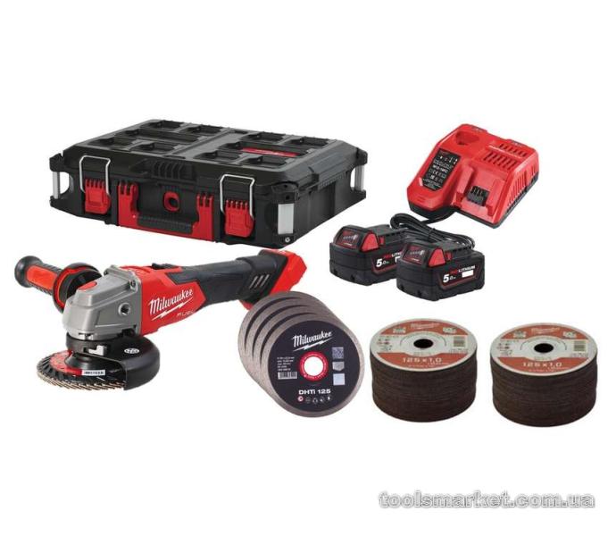 Шліфмашина кутова акумуляторна MILWAUKEE, M18 FSAGSVO125X-502X, діаметр 125мм (+зар.пр.,2ак.Х5Аг,HDкейс)