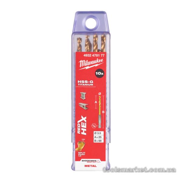 Свердло по металу RedHEX HSS-G TiN MILWAUKEE, діаметр 3,5 мм (10шт)