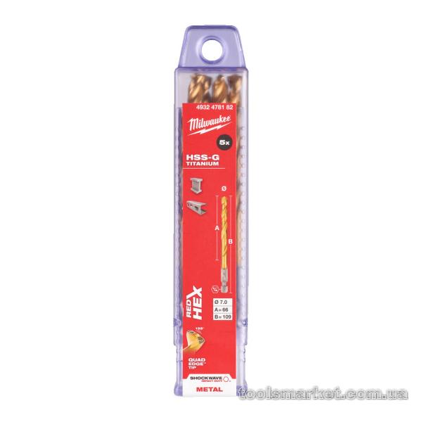 Свердло по металу RedHEX HSS-G TiN MILWAUKEE, діаметр 7 мм (5шт)