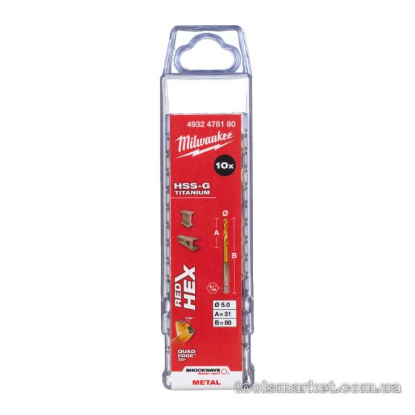 Свердло по металу RedHEX SHOCKWAVE™ HSS-TiN MILWAUKEE, діаметр 5,0х80х31мм, (10шт)