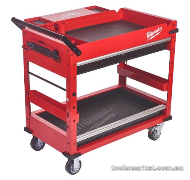 Візок відкритий 40˝ / 102 см (1 шт) Ящики із системою плавного закриття розраховані на 45 кг. Нижня скринька витримує навантаження до 90 кг. Додаткові вбудовані рішення для зберігання. 2 знімні чашки для зберігання, які можна перевернути догори дном, щоб створити рівну поверхню, або повністю зняти для додаткового місця під інструмент. Вбудовані V-подібні пази для фіксації труб та інших матеріалів під час різання. Складна задня полиця вантажопідйомністю 22 кг. 2 знімні бічні полиці для зберігання пляшок, спреїв та іншого обладнання. Гумові кутові борти запобігають пошкодженню при переміщенні візка. Подовжувач на магніті дозволяє заряджати акумулятори безпосередньо на візку. Колеса індустріального класу діаметром 125 мм (2 фіксовані, 2 поворотні зі стопором) Загальна вантажопідйомність 315 кг. Габарити (мм) 1016 x 561 x 991 Розміри [внутренние ] [В х Ш х Д | мм] top drawer (1x): 94 x 887 x 417; bottom drawer (1x): 68 x 875 x 492