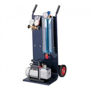Заправочная станция состоит из заправочного цилиндра, вакуумного насоса и манометрического коллектора, скомпонованных на специальной тележке