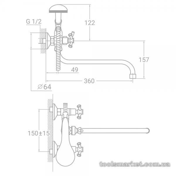 - Шланг для душу (нержавіюча сталь, 1500 мм), лійка для душу (АВS-пластик, 1 режим), кронштейн (цинк)